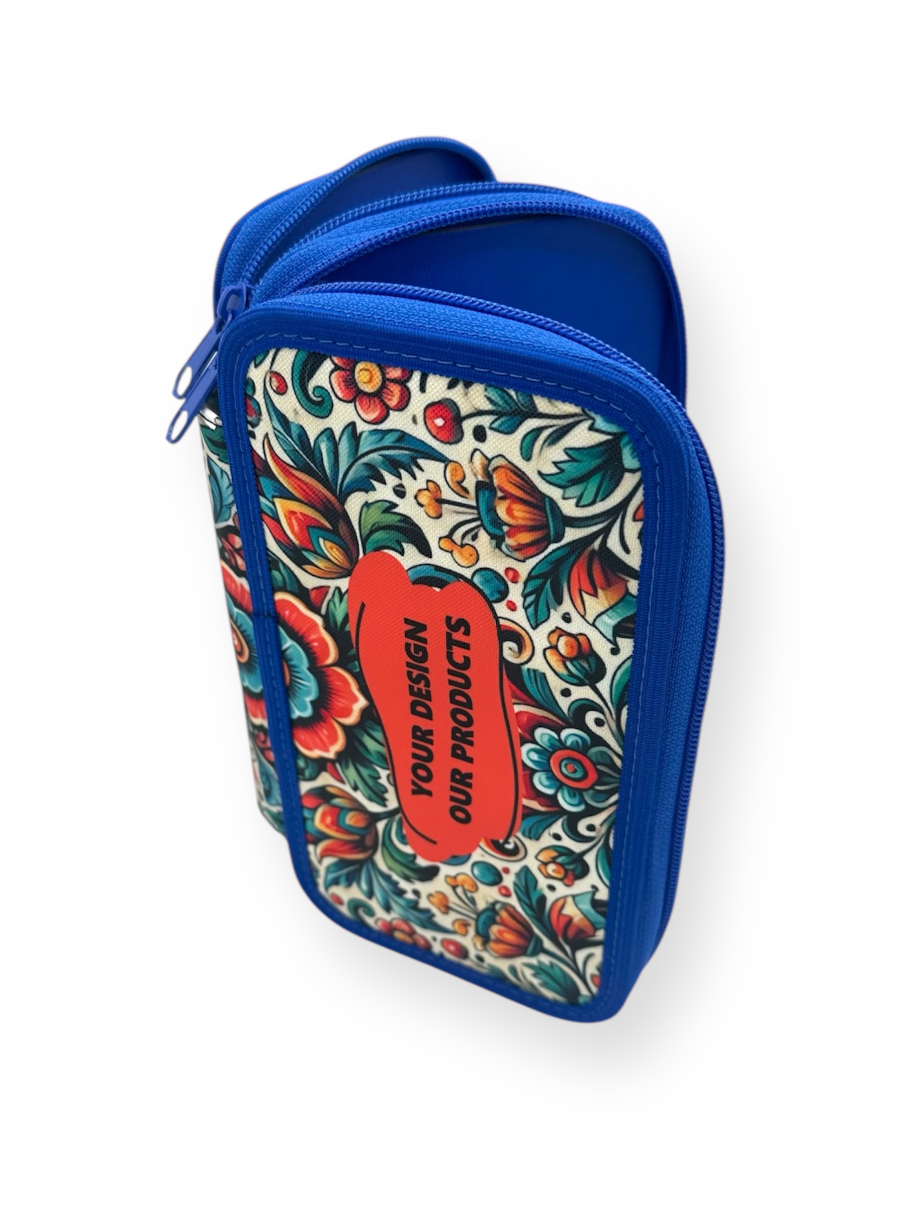 Powłoka zewnętrzna piórników wykonana jest z tkanin 100% poliestrowych. Aplikacje wykonane drukiem sublimacyjnym. Wnętrze wykonane z kartonu pokrytego folią.