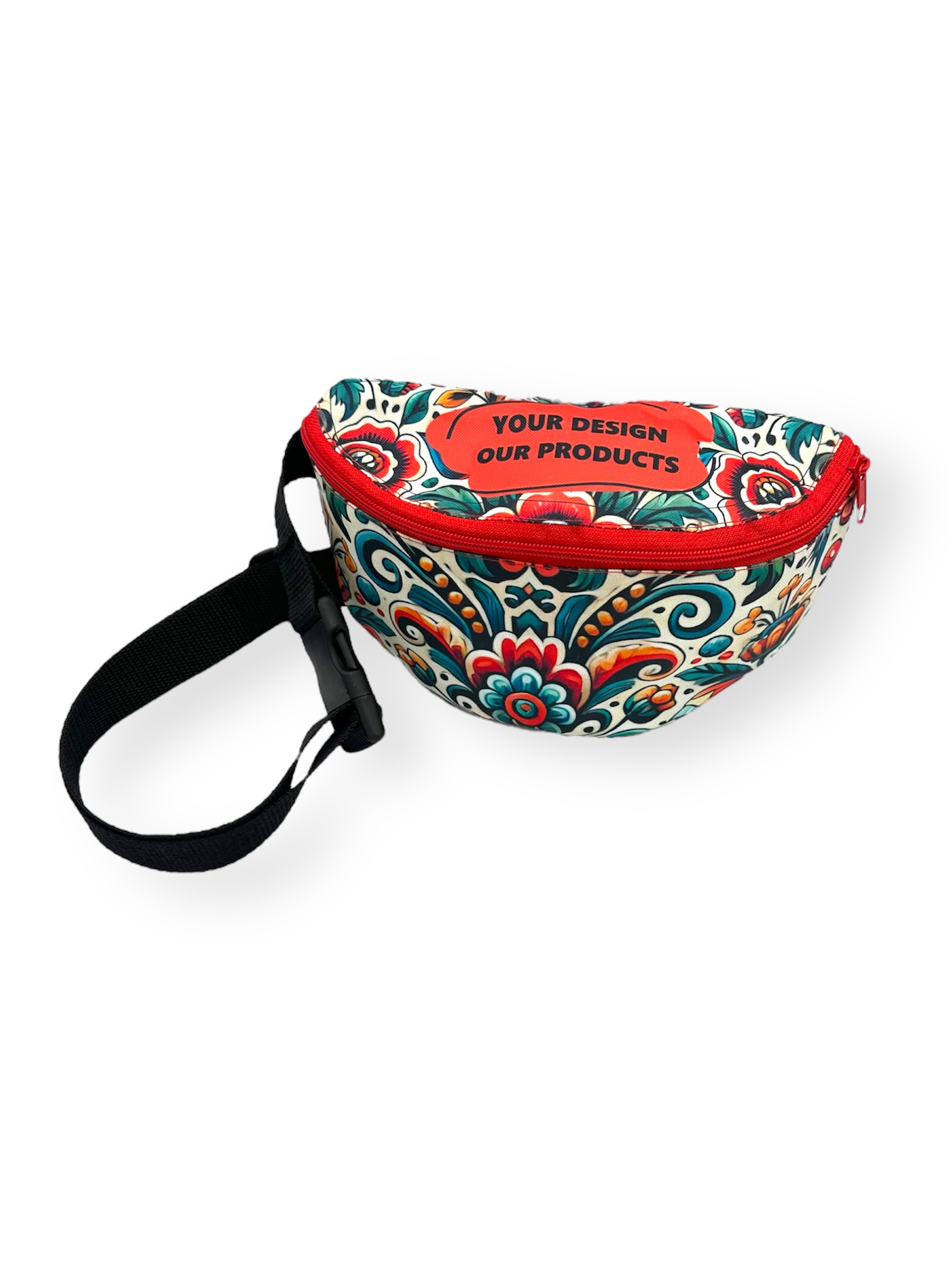 Duża nerka wykonana z 100% poliestru z nadrukiem w pełnej kolorystyce wg projektu klienta. Posiada jedną główną komorę, zamykaną na zamek błyskawiczny. Pasek w pasie regulowany plastikową regulacją.