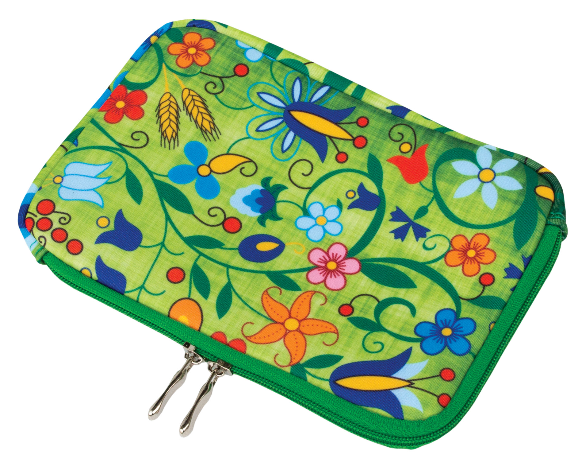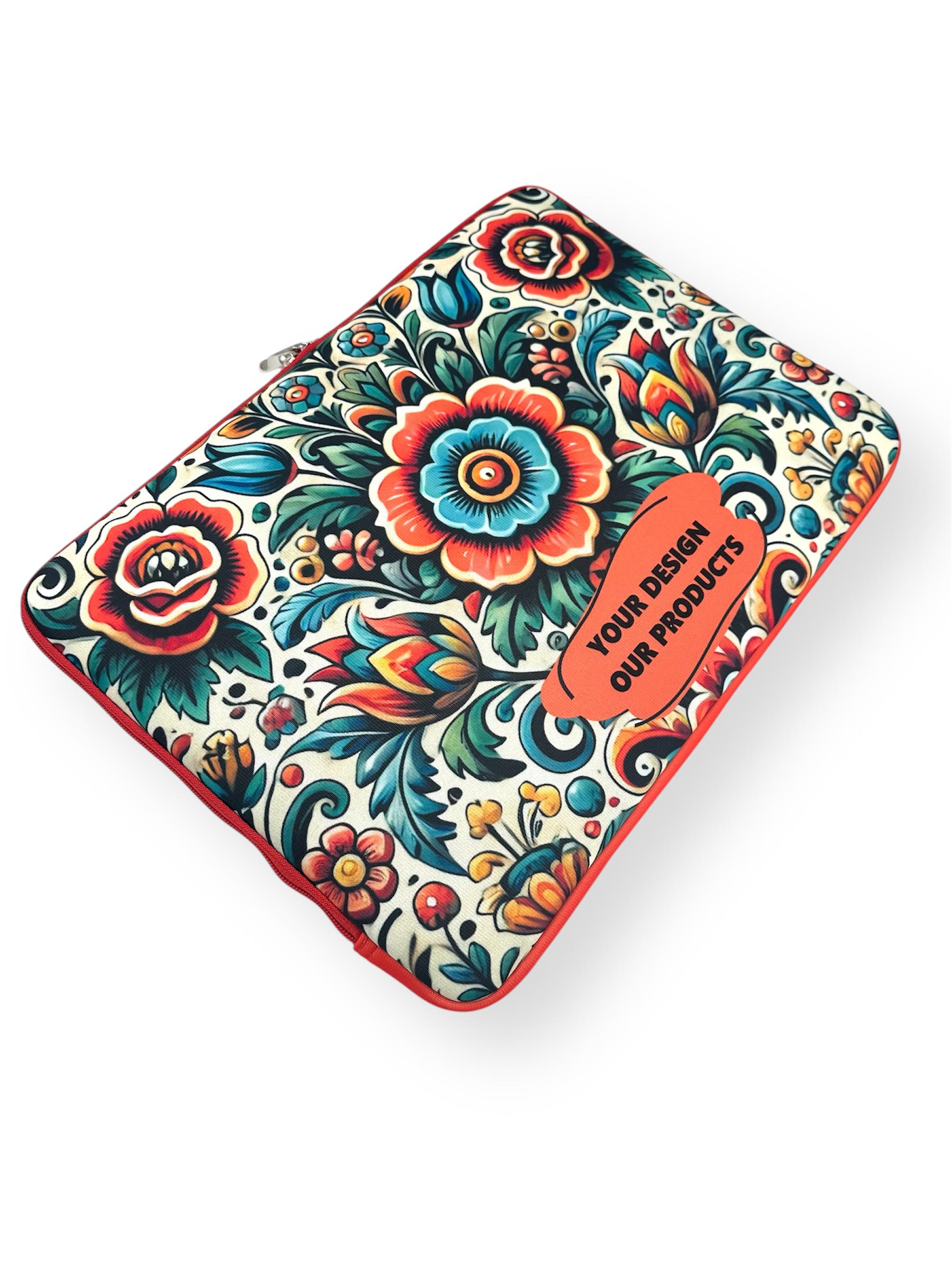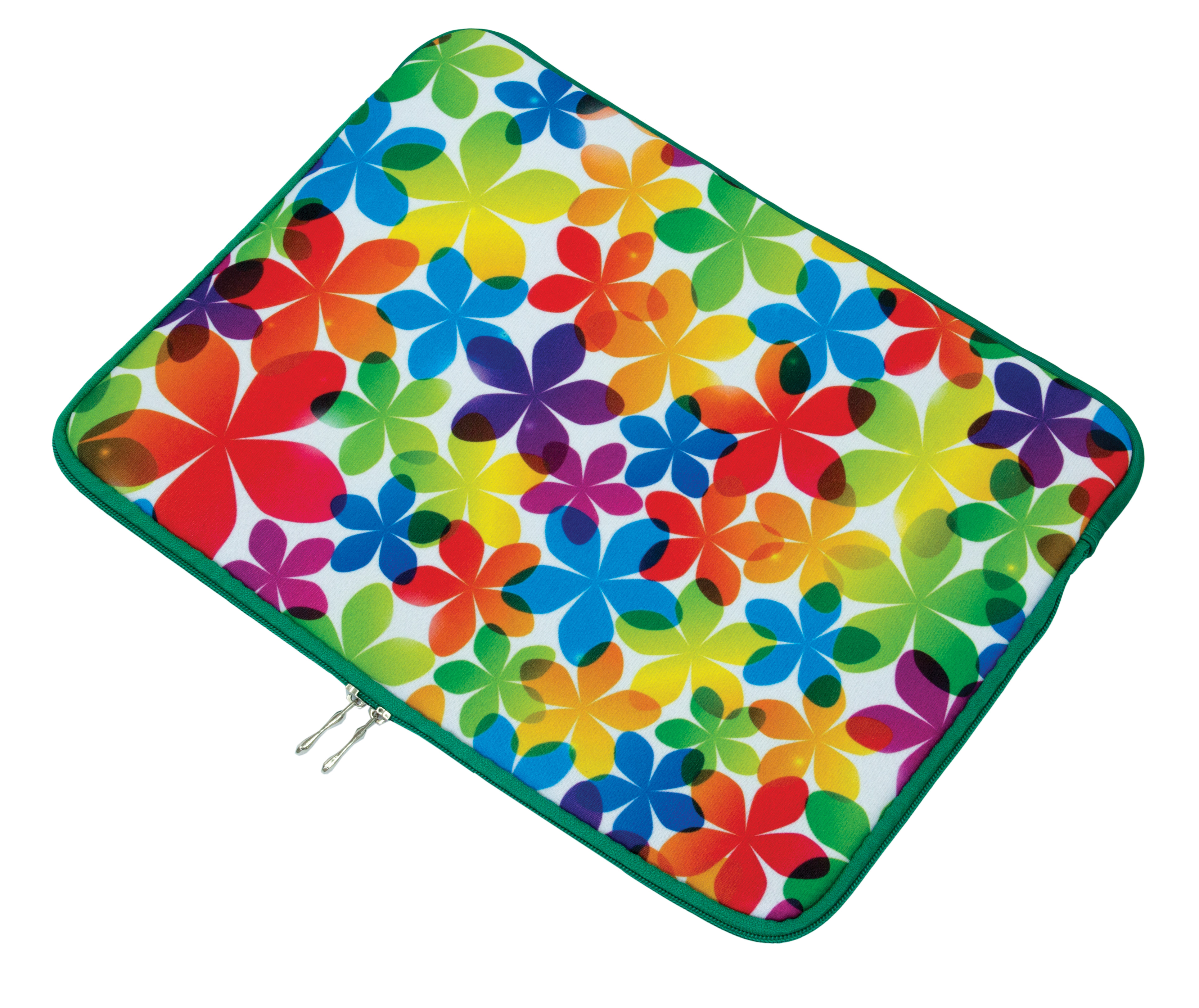 Etui na laptop wykonany z tkaniny piankowej bez rączki. Z zewnątrz nadruk w pełnej kolorystyce wg projektu klienta. Wnętrze w kolorze szarym wykończone lamówką.