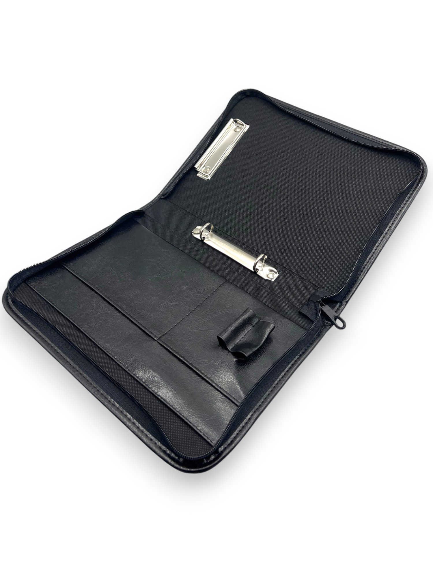 Teczka zamykana jest solidnym zamkiem błyskawicznym, a jej zewnętrzna powłoka wykonana została z wytrzymałej tkaniny skóropodobnej, odpornej na zabrudzenia i uszkodzenia.