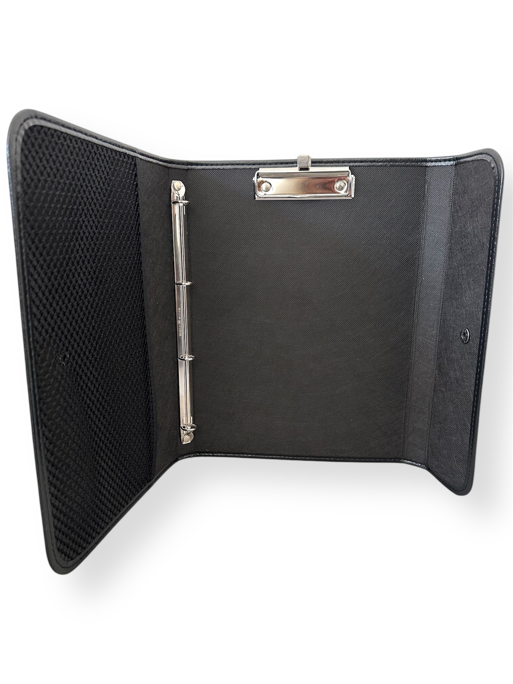 Solidnie wykończona, elegancka teczka konferencyjna. Praktyczna teczka na materiały konfrencyjne z mechanizmem ringowym na 4 koła, dwiema ukośnymi kieszeniami, wlotem na długopis, zamykana na zatrzask. Pomieści dokumenty A-4.